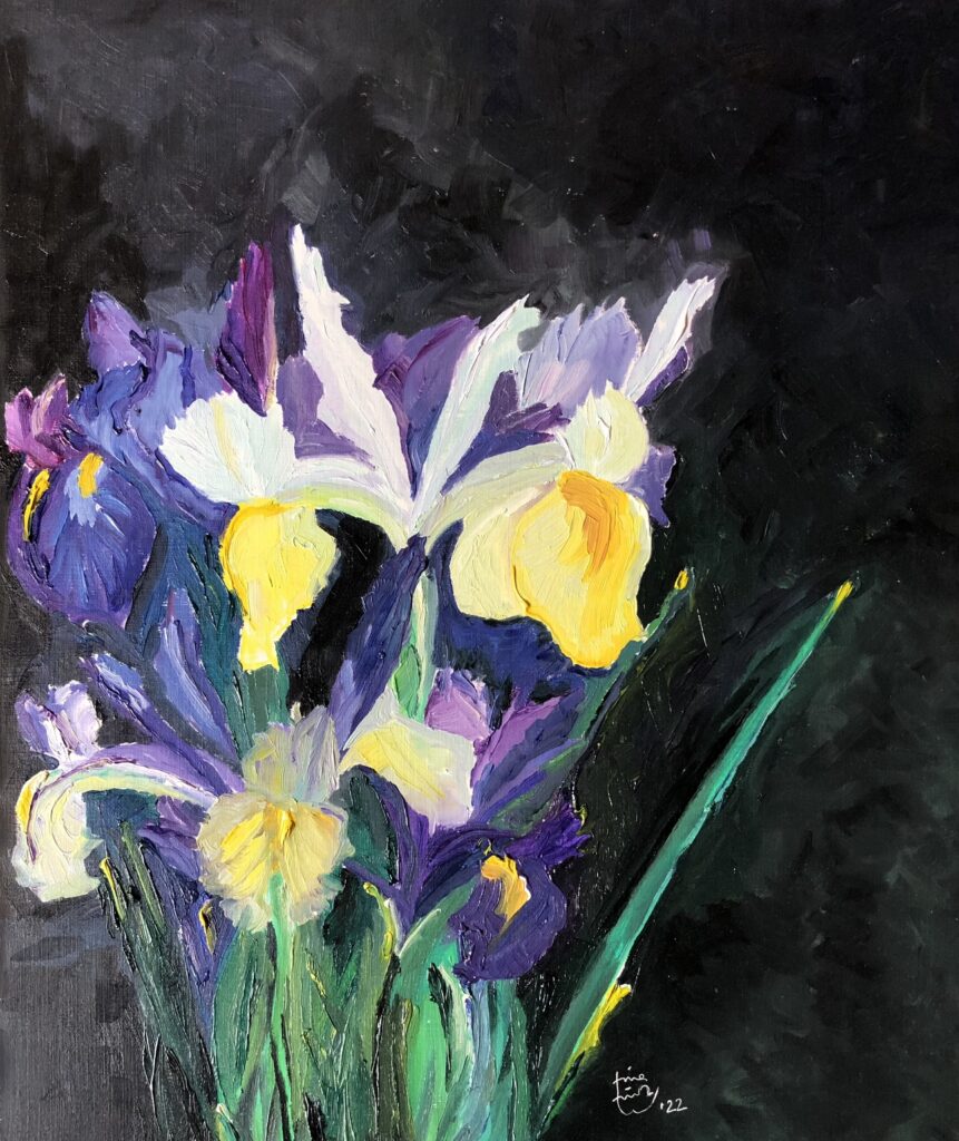 painting . Violet Bouquet of Irises Oil on Special paper with linen embossing for oil painting 240g/sqm Dimension W / H 30x35cm . 90 EUR unframed.