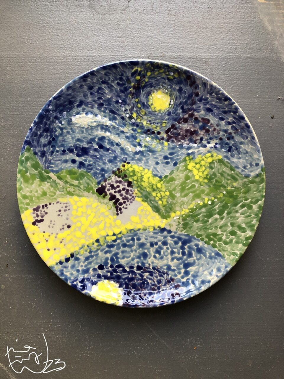 painting . sheep in the buttercup field Mineral ceramic paint on raw ceramic . glazed and burned Dinner plate small
