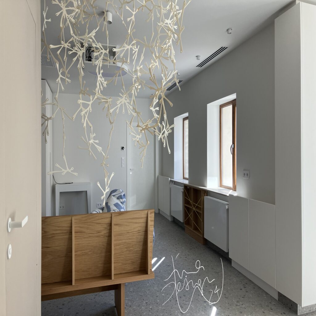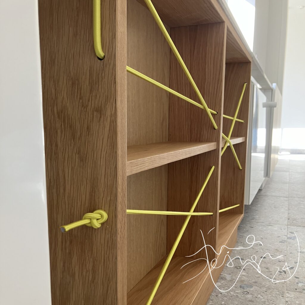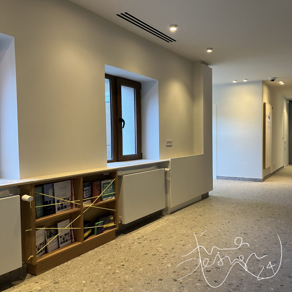 waiting area in a psychological cabinet . embedded book display . customised furniture created in collaboration with KPEmobart.