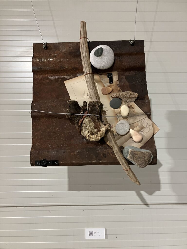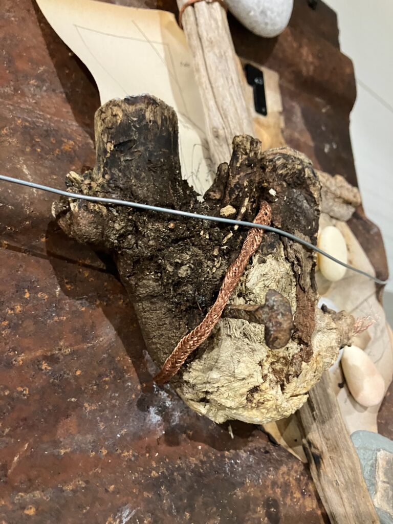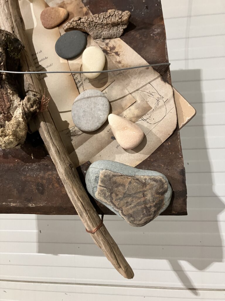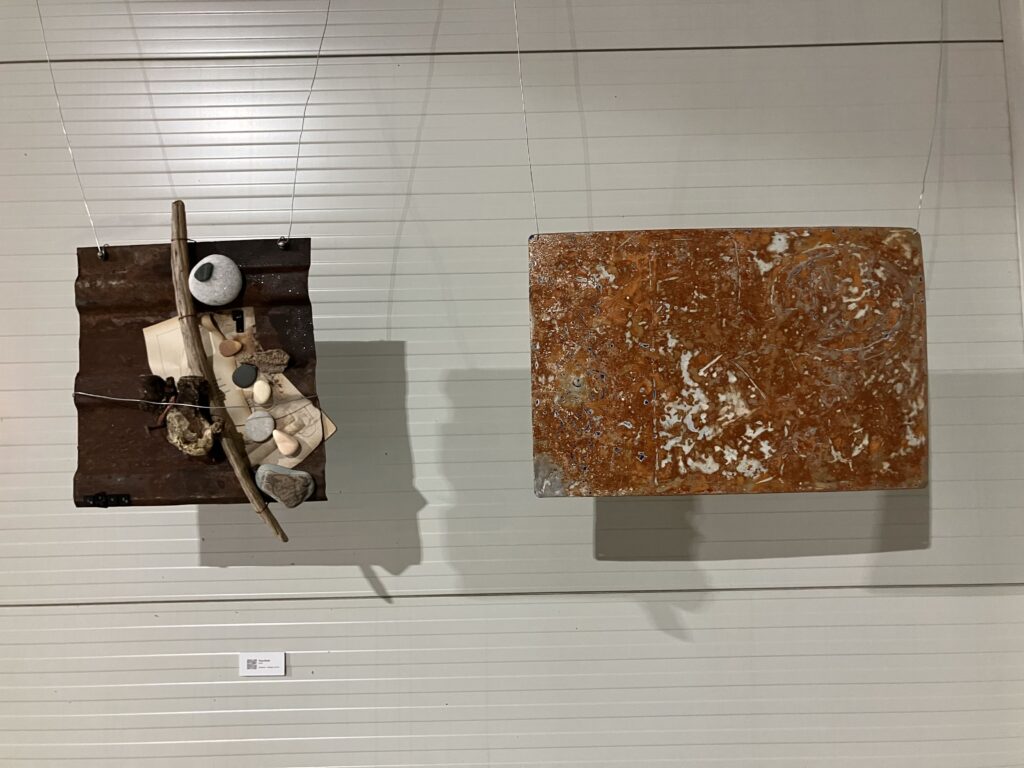 It was exhibited in combination with Expiration II – Geology of a Life. Presented within the exhibition Trame, Expiration I and II – Geology of a Life examines erosion as both a material process and a metaphor for human consciousness. The work brings together naturally weathered elements—stones, driftwood, and oxidized metal—with fragmented textual excerpts from Faust (Parts I and II). These components are assembled as stratified layers, evoking geological formations in which time, pressure, and accumulation shape form and meaning.