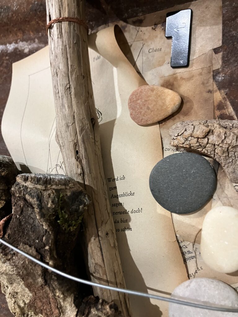 Combining eroded natural materials with fragmented excerpts from Faust (Parts I and II), this work explores erosion as both a physical and epistemological process. Stones, driftwood, oxidized metal, and destabilized language form layered structures that evoke geological time. Removed from narrative continuity, text becomes material residue, positioning texture as a site where emotion emerges through accumulation, fragmentation, and loss.