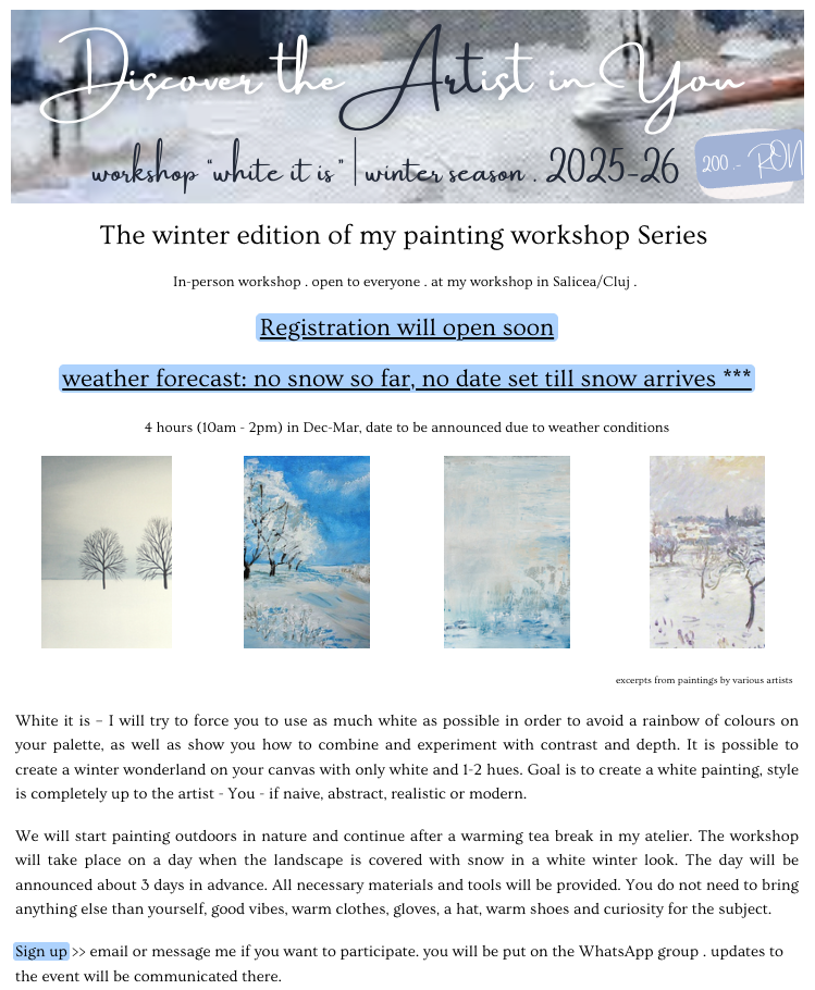 I offer you the possibility to find out. Contact me and we will talk about what kind of workshop suits you. I offer group workshops as well as private individual sessions. Outdoors like the old masters. You, an easel, paint and Mother Nature.